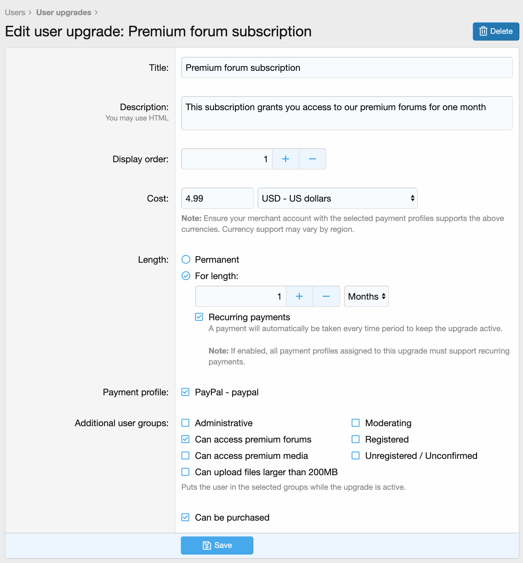 Because user upgrades are usergroup based, which in turn bring the permissions system to the table, you are able to attach a monetary value to any feature or area of your community.